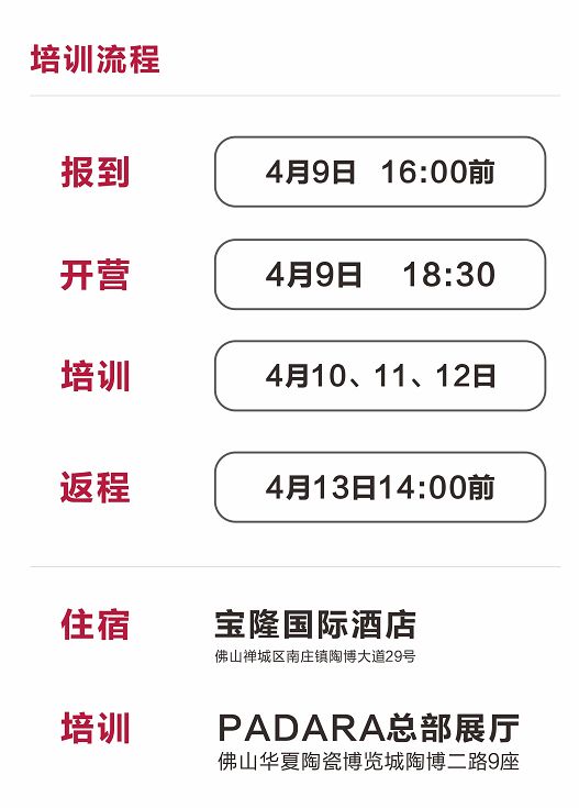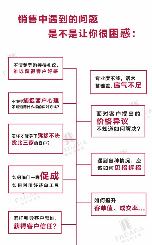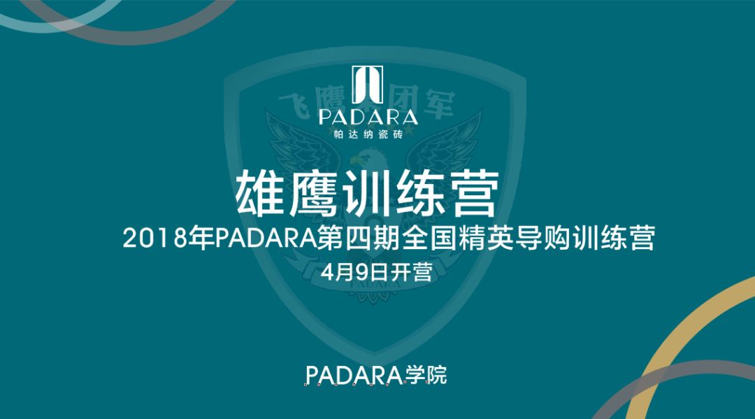PADARA(帕达纳瓷砖)第四期全国精英导购训练营——雄鹰训练营,是引爆PADARA终端店面成交的杀单神器。训练营根据终端导购的销售过程作出一套全面的经验总结,不仅在导购礼仪、专业知识、解决异议上给到实在的干货,而且同时通过ABC模拟演练、案例分享、学员互评、团队展示通关等内容,提升导购积极性和销售能力。